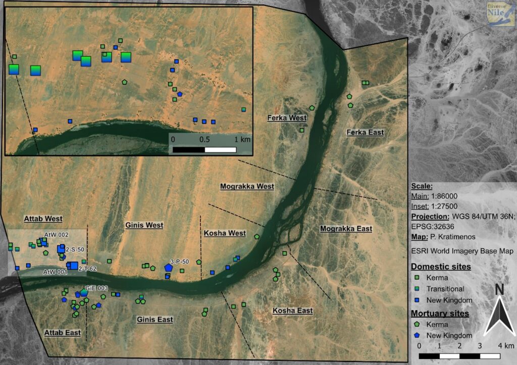 Kerma and Egyptian New Kingdom domestic and mortuary sites in the Attab-Ferka region, inset map highlights various 2-S-43 sites.